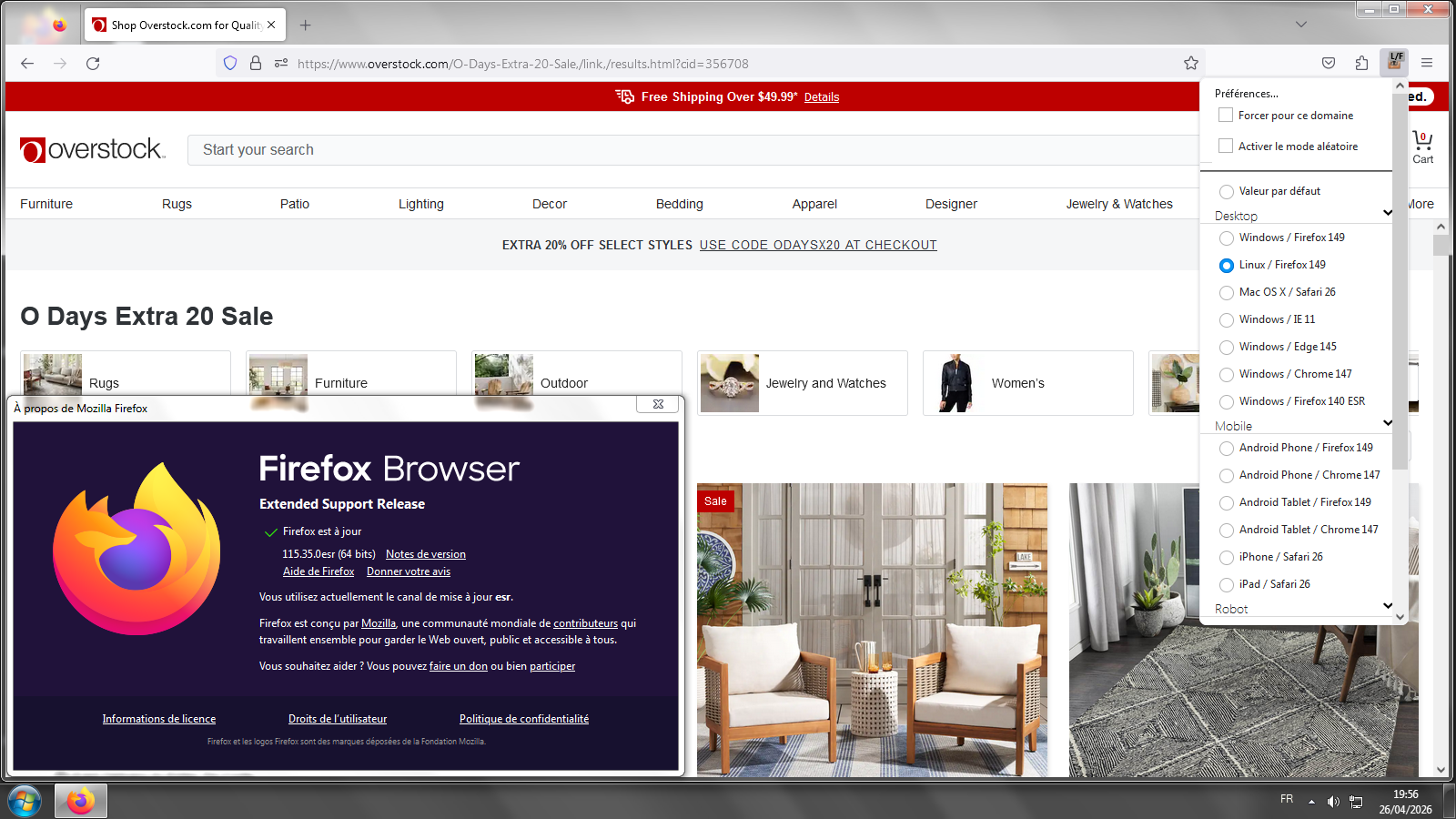 If you wish to try User Agent Switcher https://addons.mozilla.org/firefox/addon/uaswitcher