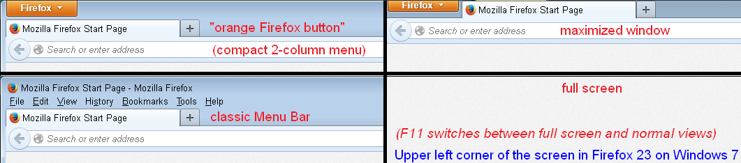 On Windows, the upper left corner of the Firefox window can have a variety of appearances. Here's a screen shot of some of them.