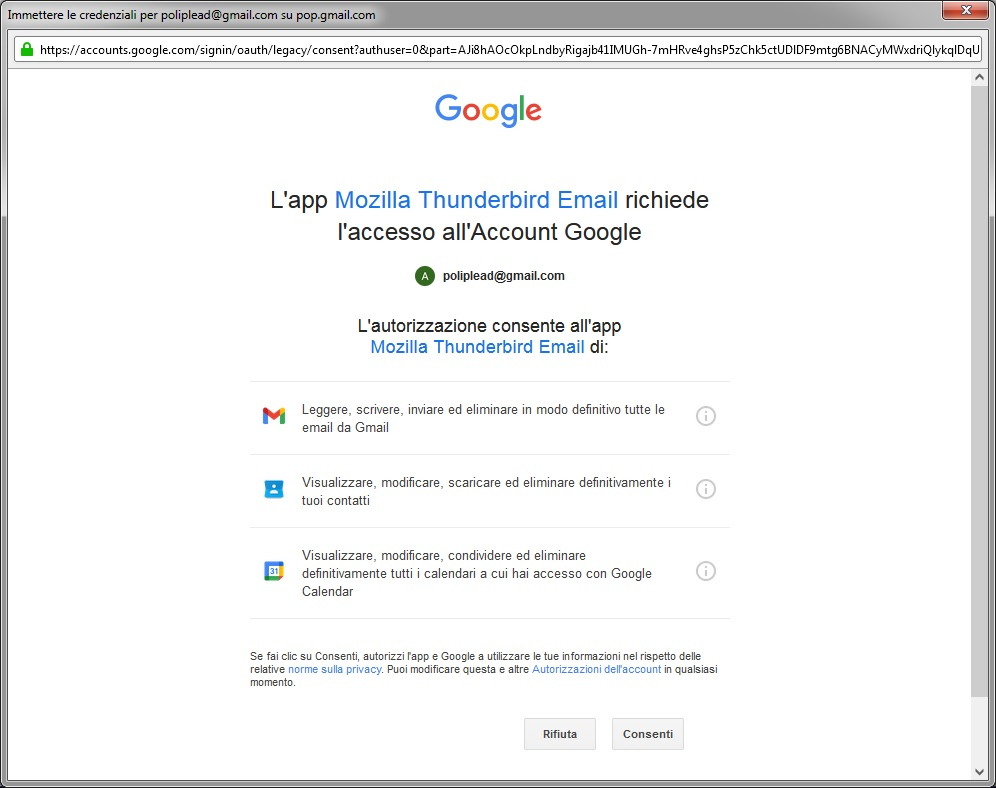 Ho già provato tutte le indicazioni che mi hai fornito, le avevo già lette e applicate a più riprese, sperando che fosse un problema che sarebbe stato risolto con i continui aggiornamenti. Il problema si è verificato in occasione, appunto, dell'aggiornamento degli account gmail. Per tutti gli altri account l'aggiornamento è andato bene, mentre per questo account ha cominciato ad apparire il popup che ho indicato. Infatti da allora ho dovuto impostare in gmail il reindirizzamento della posta su un secondo account. Però tutte le volte che chiedo di scaricare i messaggi su tutti gli account, questo popup appare e non posso fare altro che chiuderlo, senza poter scaricare i messaggi, così come non posso utilizzare l'account per inviare messaggi tramite Thunderbird. Quello che mi sembra strano è quello che accade quando premo il pulsante Consenti o Rifiuta nel popup. Dopo la pressione del tasto, entrambi i tasti vengono disabilitati, ma poi non accade più nulla. Ho provato anche ad aspettare qualche ora, ma il popup rimane aperto; se lo chiudo, lo scaricamento dei messaggi prosegue dall'account successivo.