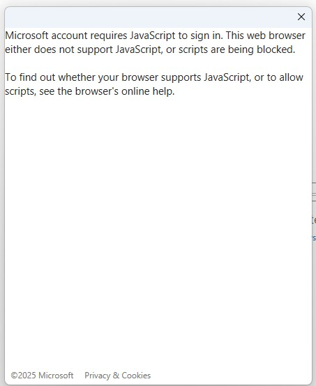 When I try to sign into microsoft outlook or an app, the pop-up dialog box says: "Microsoft account requires JavaScript to sign in. This web browser either does not support JavaScript, or scripts are being blocked.