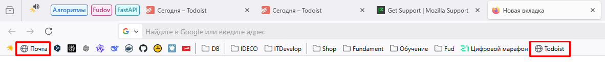 Good afternoon, Firefox support team! I've been having trouble displaying icons on my bookmarks bar for quite some time now. Usually, when bookmarks are added to the bookmarks bar, they are added with empty icons. Then, when you click on the link, the icon loads and appears in the browser on the bookmarks bar. For some reason, not all icons load. So in the attached screenshot, two bookmarks are highlighted, with which the described problem occurs. There may be more such problems, but it is not entirely clear what they are related to.