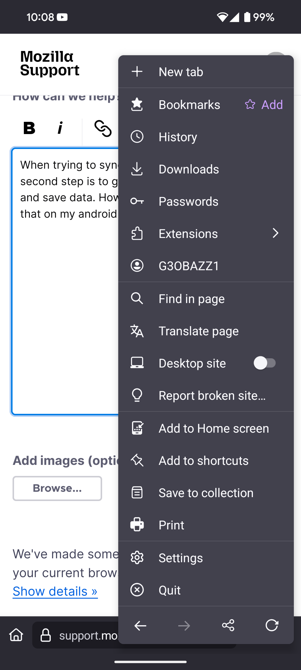 When trying to sync Firefox on my phone, the second step is to go to the menu, and tap sync and save data. However there is no button like that on my android version of Firefox.