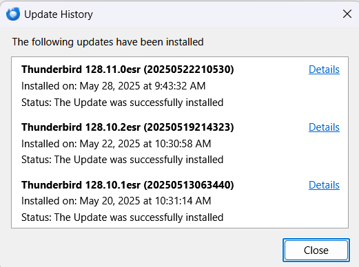 Here is the last update log: 2025-05-28 09:43:38-0400: sUsingService=false 2025-05-28 09:43:38-0400: sUpdateSilently=false 2025-05-28 09:43:38-0400: useService=true 2025-05-28 09:43:38-0400: isElevated=false 2025-05-28 09:43:38-0400: gInvocation=UpdaterInvocation::First 2025-05-28 09:43:38-0400: Writing status to file: applying 2025-05-28 09:43:38-0400: Performing a replace request 2025-05-28 09:43:38-0400: PATCH DIRECTORY C:\ProgramData\Mozilla-1de4eec8-1241-4177-a864-e594e8d1fb38\updates\D78BF5DD33499EC2\updates\0 2025-05-28 09:43:38-0400: INSTALLATION DIRECTORY C:\Program Files\Mozilla Thunderbird 2025-05-28 09:43:38-0400: WORKING DIRECTORY C:\Program Files\Mozilla Thunderbird\updated 2025-05-28 09:43:38-0400: Checking whether elevation is needed 2025-05-28 09:43:38-0400: Failed to open update lock file: 5 2025-05-28 09:43:38-0400: Can't open lock file - seems like we need elevation 2025-05-28 09:43:38-0400: After checking IsProgramFilesPath, useService=true 2025-05-28 09:43:38-0400: After checking IsLocalFile, useService=true 2025-05-28 09:43:38-0400: After checking IsUnpromptedElevation, useService=true 2025-05-28 09:43:38-0400: Writing status to file: failed: 58