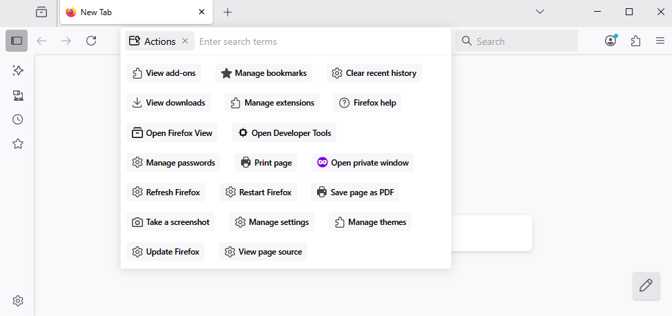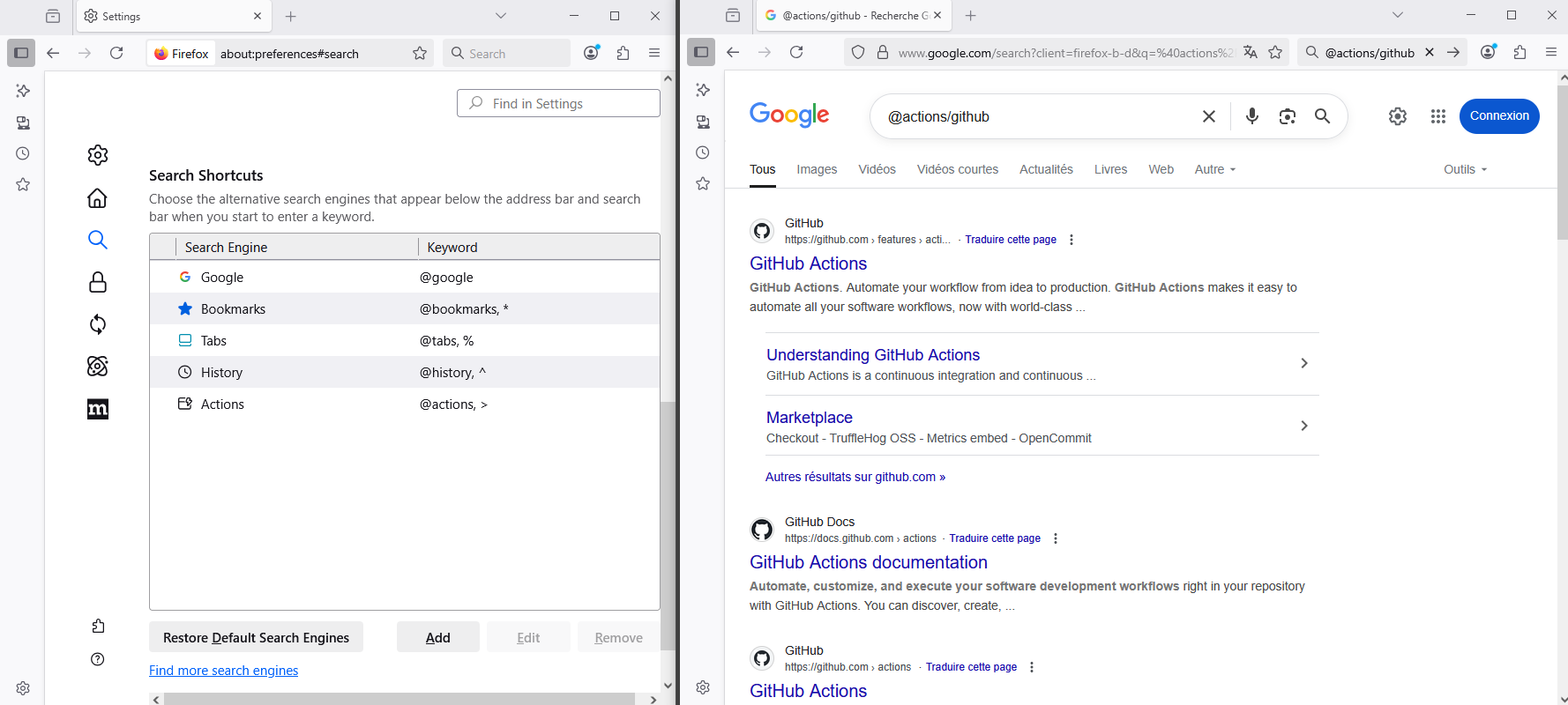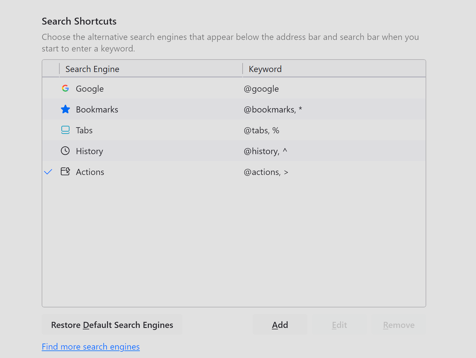 Assign a keyword shortcut https://support.mozilla.org/en-US/kb/assign-shortcuts-search-engines, Remove Shortcut Bookmarks, Tabs, History, Actions, no idea.