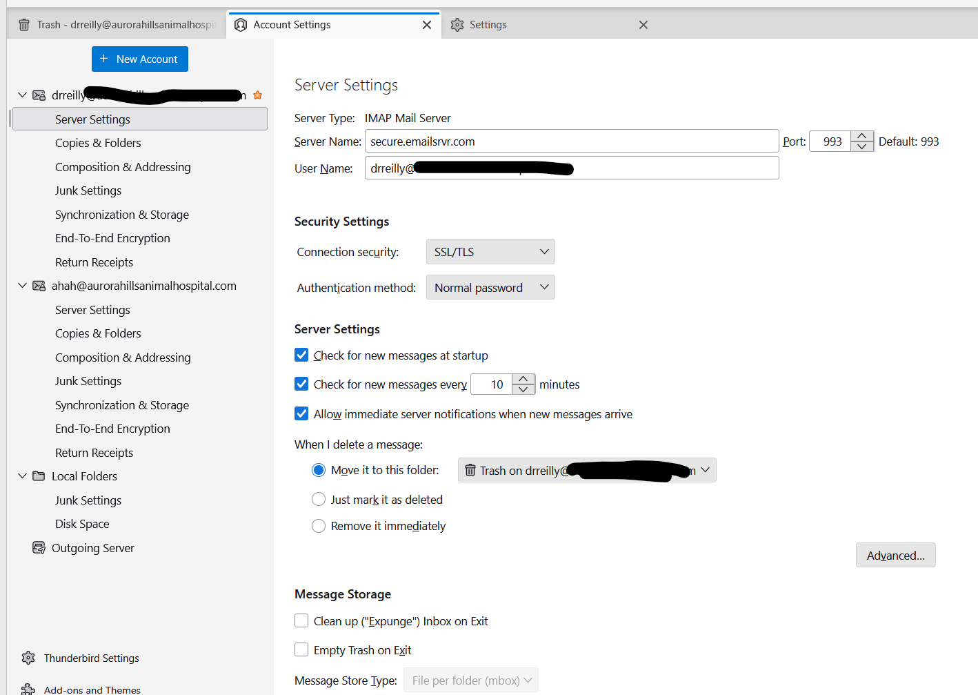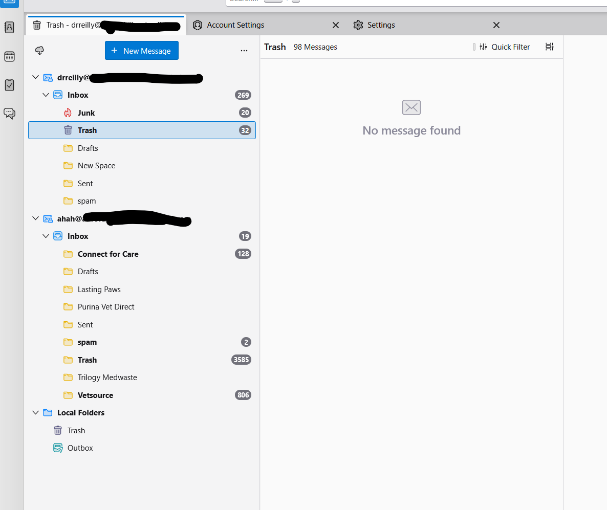 First off I have multiple Trash bins, one for each account listed under the Inbox and then one in the Local Folders area, so I am not completely sure why the Local Folders one exists and what it's purpose is for. When I delete a message from the DrReilly account it is removed from the Inbox and and I see the number count go up on my Trash folder under the Inbox. However, when I go to the Trash folder it is completely empty but indicates I have messages in it (see Screenshot 1). I have toggled Unread, Stared, Contacts, Tags, & Attachments and the messages never show. I have verified that when I delete a message it is supposed to direct the messages to the Trash bin (see Screenshot 2).