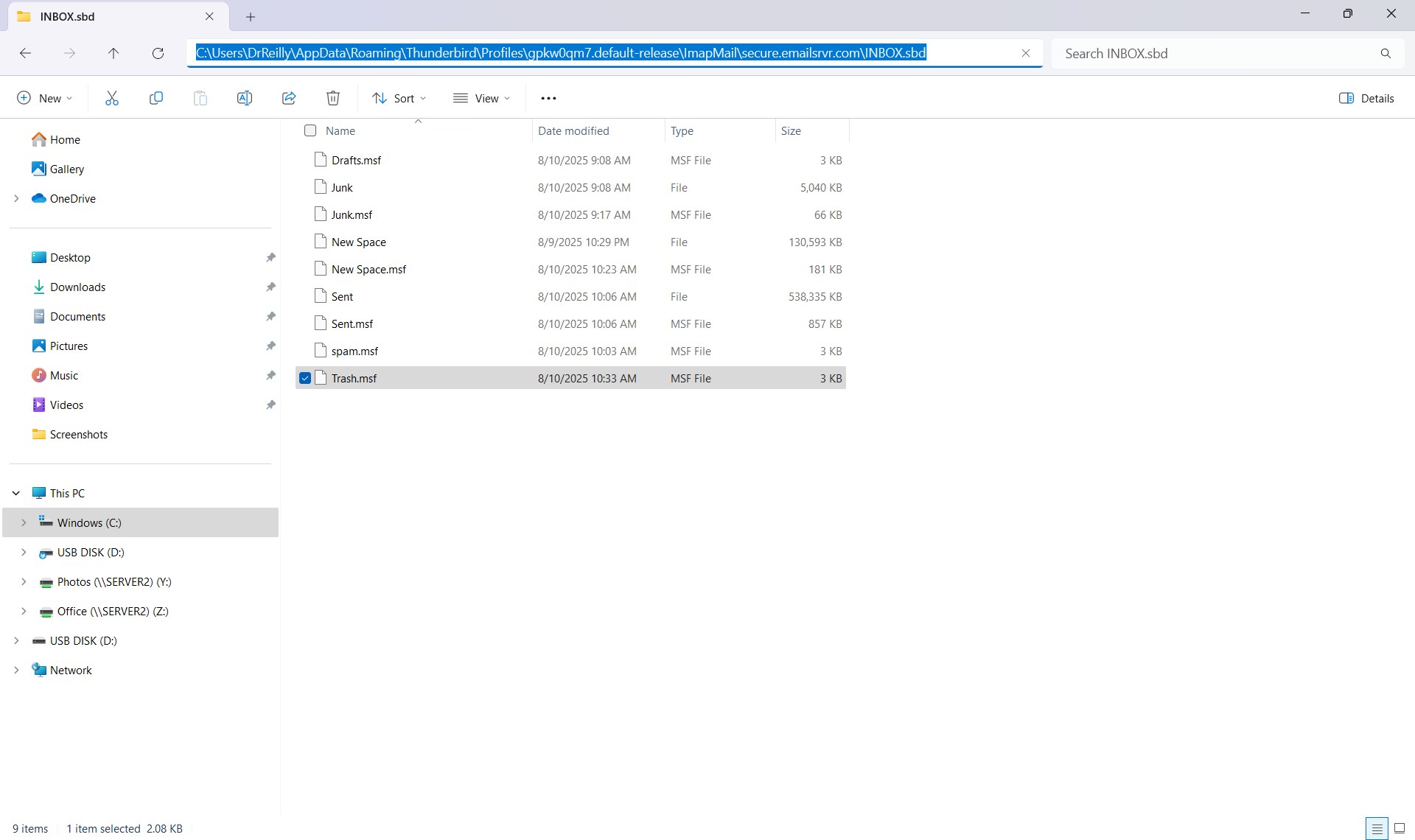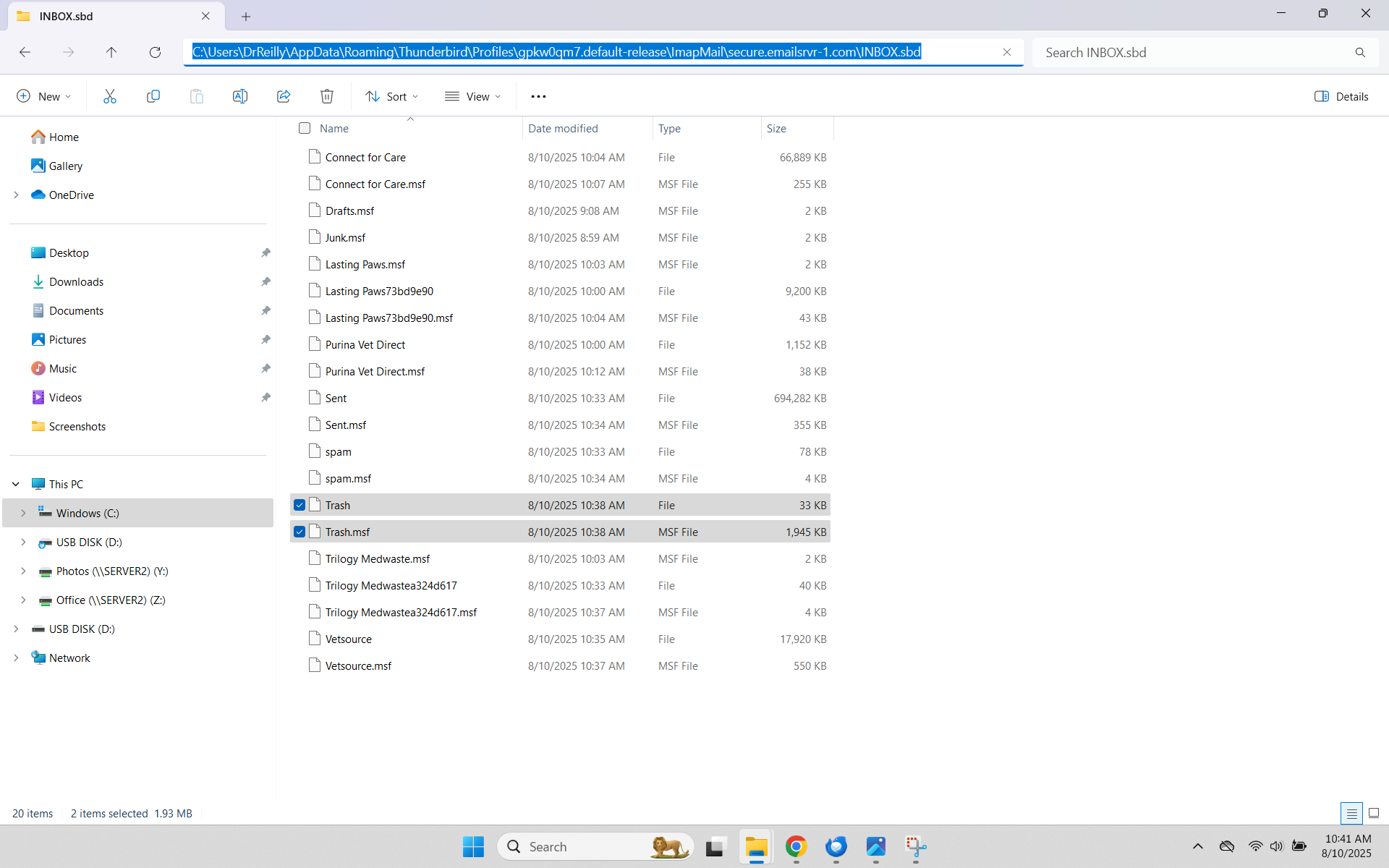 The interesting thing is my issue is only with the DrReilly account, the deleted messages are showing up in the AHAH account (also an IMAP) with no issues. The only thing I can see different about the 2 accounts is that in the AHAH account folders it has a Trash & a Trash.msf file (see Screenshot 4) and the DrReilly account folders only have the Trash.msf file (see Screenshot 3).