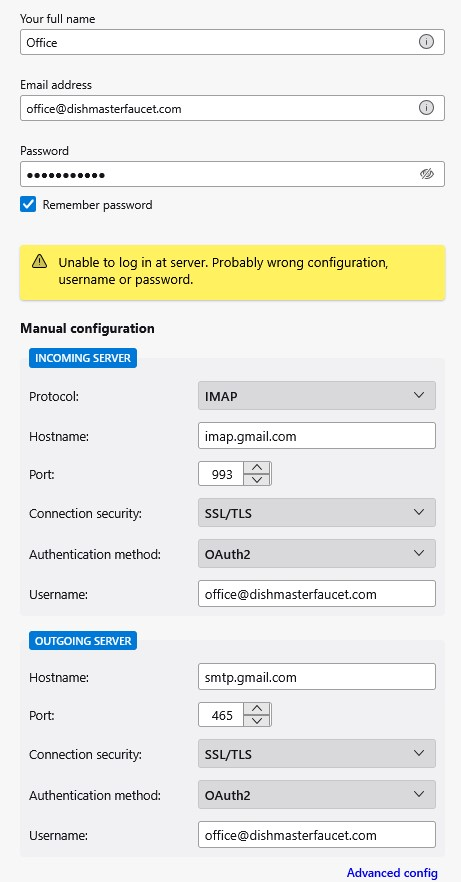 account stopped receiving messages after 140.1.1esr update I deleted the account. I then tried to add a new account. It does not ask for a password but only Name and Email. Response: "Unable to log in at server. Probably wrong configuration, username, or password". Two other workstations use the same account and they are not having any issues with the account.