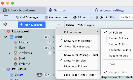 click view>folders and tick unified folders. then, click the 'inbox' and then rightclick and properties and then choose to confirm that you have selected the desired accounts repeat for sent, trash, etc.
