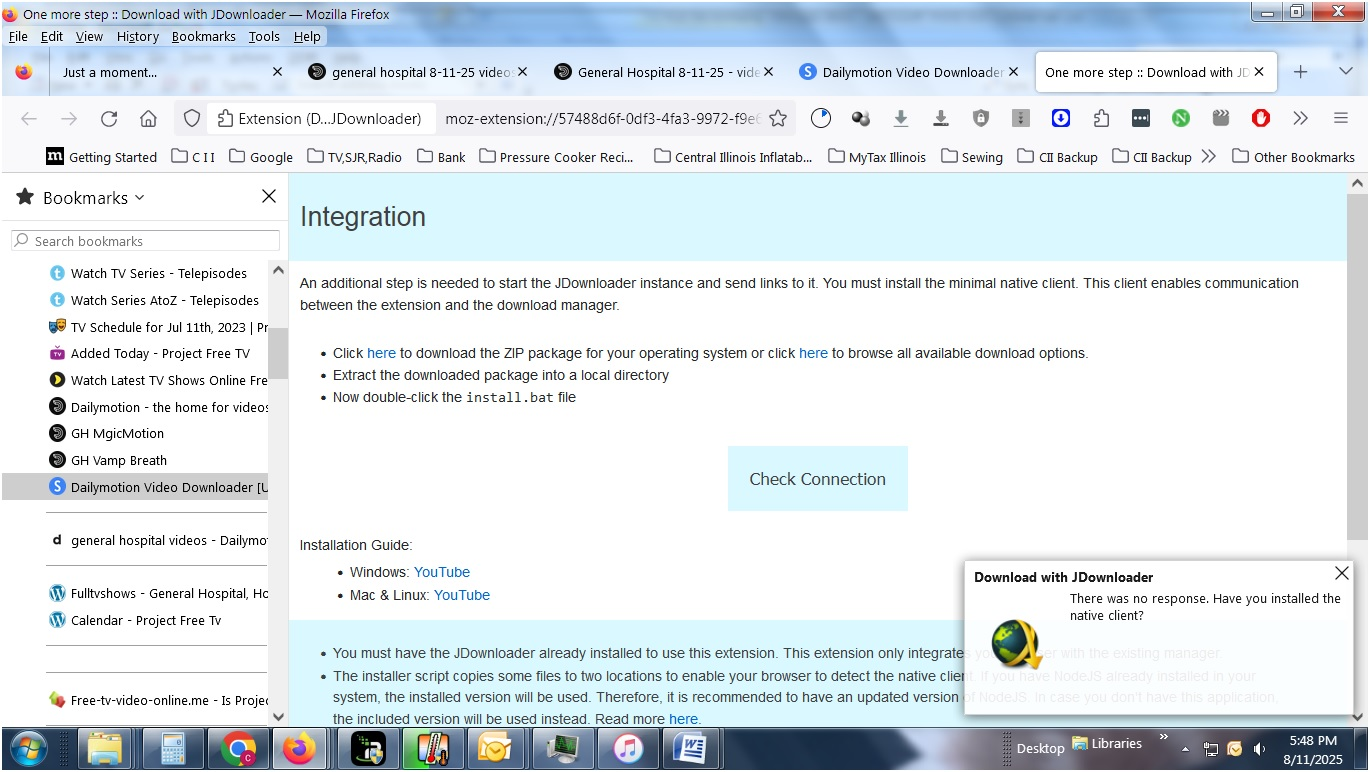 Firefox 115.26.0esr will not allow me to download any files without producing an error message that I need to download the native client so that it can start JDownloader. I managed to download from the link the error message gave but when clicking on install.bat, it says it can't find the path and then press any key, which I do then it closes that and nothing happens.