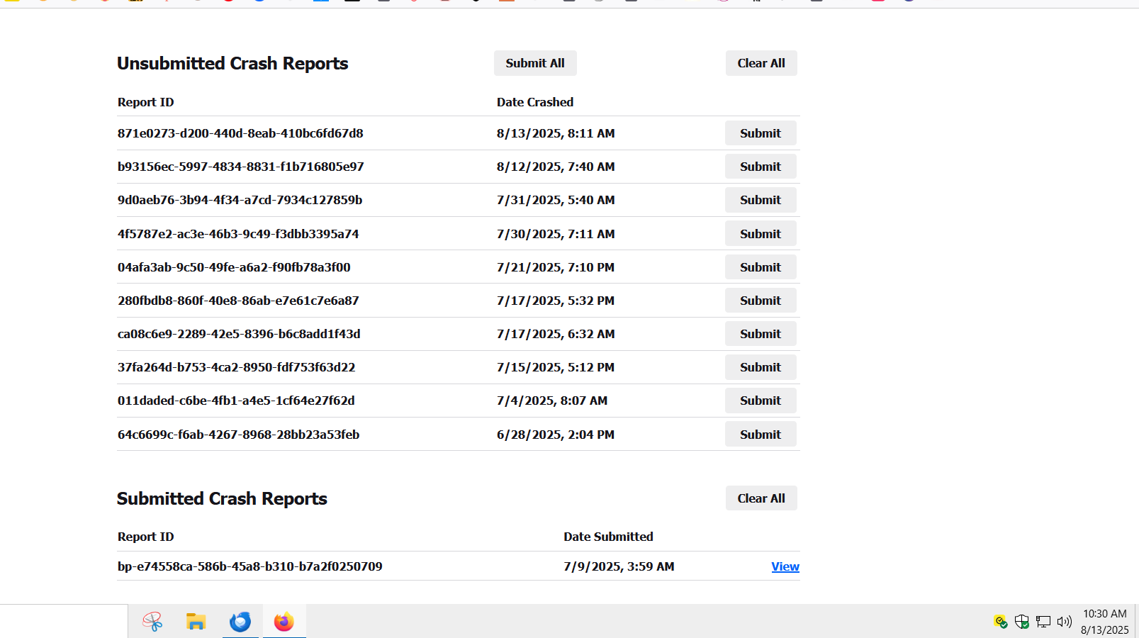 - Enter about:crashes in the Firefox address bar and press Enter. A list of Submitted (and Unsubmitted, if any) Crash Reports will appear, similar to the one shown below.