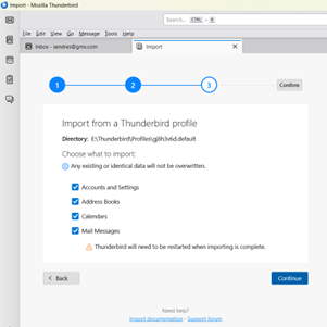 By the way, the method I just suggested assumes you have IMAP mail accounts. If so, after you restart Thunderbird, your emails and accounts will all be right where they were when you did the backup. With IMAP, any new emails will then sync up. If you don't have IMAP, and you had any activity since the backup, you might need to work much harder to merge backed up emails with any ones that you accessed after the backup, such as from the new Thunderbird install.