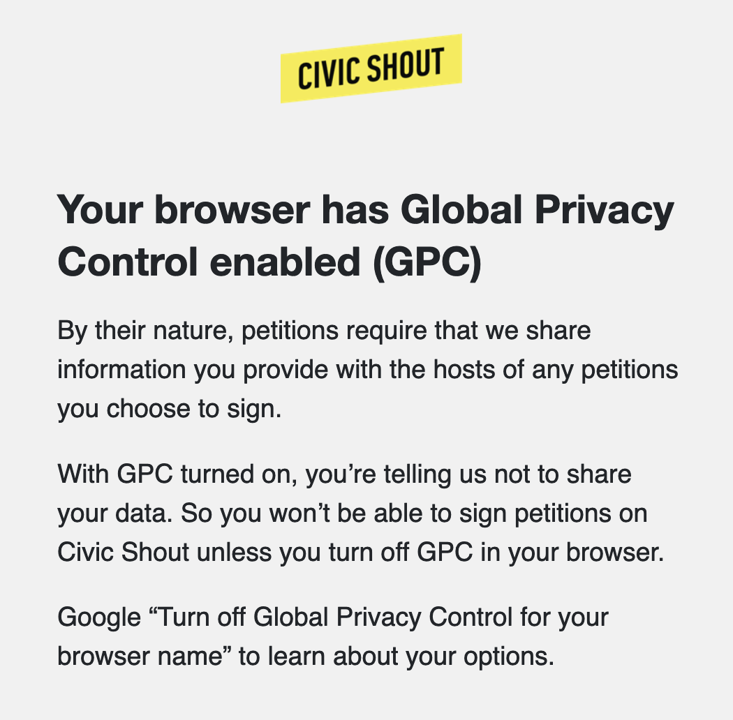 I use an IMac (15.6) to sign political petitions online on sources I trust, but the new Firefox version (128.14) seems to require that all GPC be disabled to do so. Can GPC be used selectively? Attached is a typical warning. Thanks for your expert thoughts.