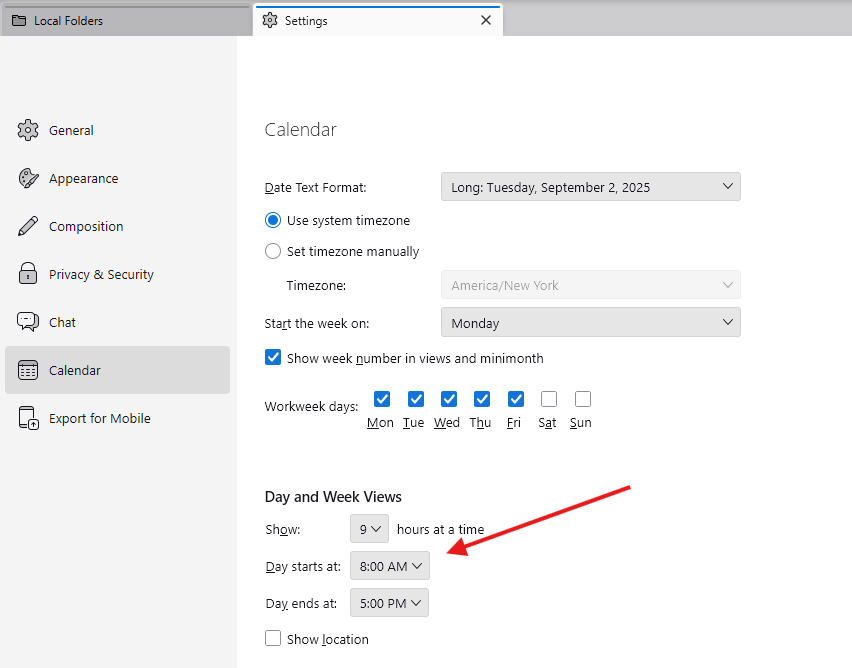 Default view of thunderbird calendar begins at midnight