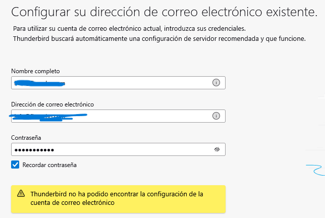 Tenía instalado y configurado thunderbird en mi pc pero tuve que formatearlo. Ahora estoy intentando instalarlo de nuevo con la misma configuración que tenía configurada pero no me es posible. Pongo mis credenciales para poder recuperlo pero thunderbird indica que no lo encuentra. Adjunto fotografía para ver si me pueden ayudar. Podría alguien ayudarme a recuperarlo tal y como lo tenía? Gracias de antemano.
