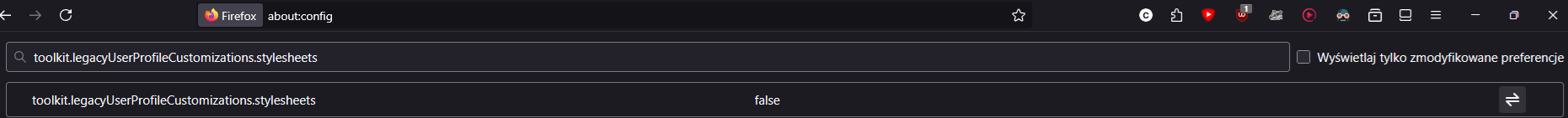 Nie mogę odtworzyć tego błędu, ale proszę jeszcze podać wartość preferencji toolkit.legacyUserProfileCustomizations.stylesheets.