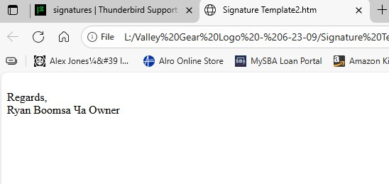 here is the code and attached is the original display image. I deleted the "version from online creation from Canva" again just leaves the lower logo a blank box....it always worked before until I updated the Logo and the OLD logo does not work now if I replace it and try. ORIGINAL FILE WAS OVERRITTEN (DUMB ME) <meta http-equiv="Content-Type" content="text/html; charset=windows-1252"> <meta name="Generator" content="Microsoft Word 11 (filtered)"> <title>Regards,</title> <style> <!-- /* Style Definitions */ p.MsoNormal, li.MsoNormal, div.MsoNormal {margin:0in; margin-bottom:.0001pt; font-size:12.0pt; font-family:"Times New Roman";} @page Section1 {size:8.5in 11.0in; margin:1.0in 1.25in 1.0in 1.25in;} div.Section1 {page:Section1;} --> </style>