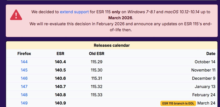 Firefox 115 ESR was originally going to end as of Fx 115.15.0esr but then Mozilla decided to continue extensions of updates since as this time is the third updates extension.