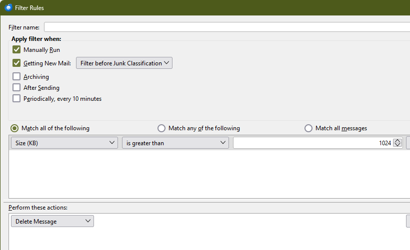 Hi, I would like to ask you if there is an option in order to have Thunderbird (latest version) to always save emails I sent to the Sent folder BUT ask me to confirm only if the email is over a specific size,say 1Mb. I am using IMAP with standard email providers e.g. gmail, yahoo, gmx.