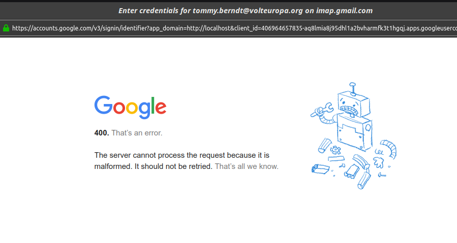 The error message returned by google is: "The server cannot process the request because it is malformed. It should not be retried. That’s all we know." And I also attached a screenshot.