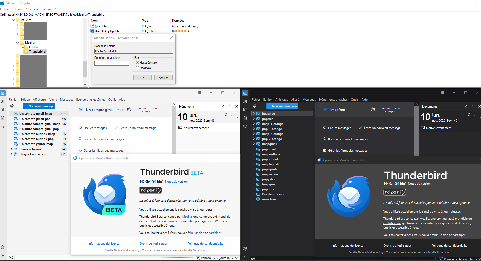 I installed Thunderbird 140.2.1 on WIndows 11 v25H2 with winget but it autoupdated to release version 144. I uninstalled release version 144, re-installed esr version and disabled Updates in Settings, but it auto-updated to release version. So I uninstalled one more time release version, installed esr 144, disabled Updates in Settings and I set up the registry key DisableAppUpdate at 1 but Thunderbird auto-updated again to release version 144.0