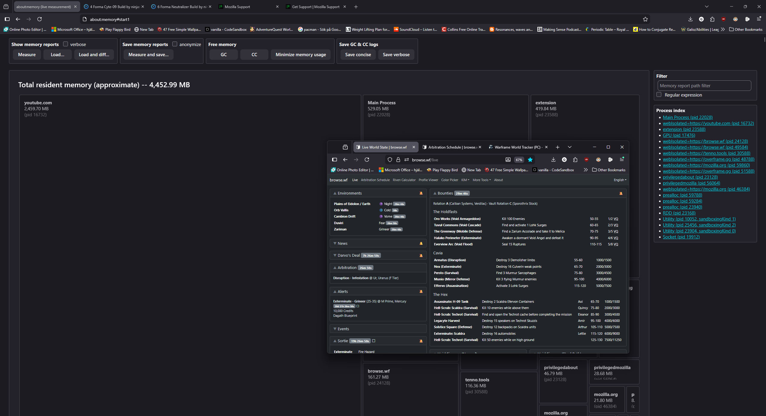 I don't know if sharing memory reports from the about:memory page give my cookies away or leave me open to a similar vulnerability so I won't share it unless a dev or similar asks for it but for now, I've included an image showing all the tabs i have open on firefox, 2 windows.
