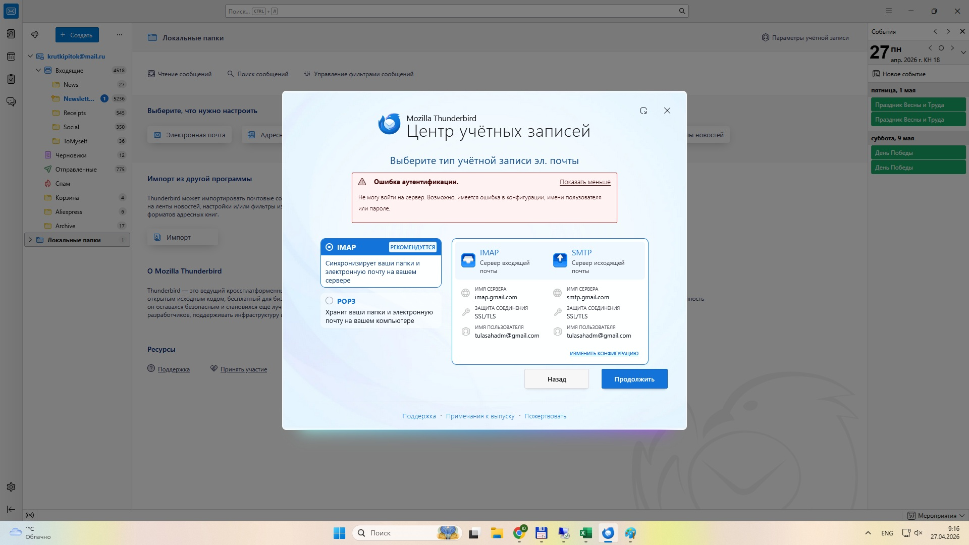 3 дня назад перестали приходить письма - вышла ошибка авторизации. Пароль точно верный (через браузер все работает) и работает Thunderbird на другом ПК. Снес мозиллу, касперского, пробую заново создать почту, не дает, смотрите скриншот 1. Потов выдает ошибку смотрите скриншот 2. Вообще не могу понять что не так! На другом ПК все работает. переносил профиль с другого ПК на свой все тоже самое - ошибка авторизации. Куки разрешены, в исключения gmail.com добавил в Thunderbird Куда копать, что искать?