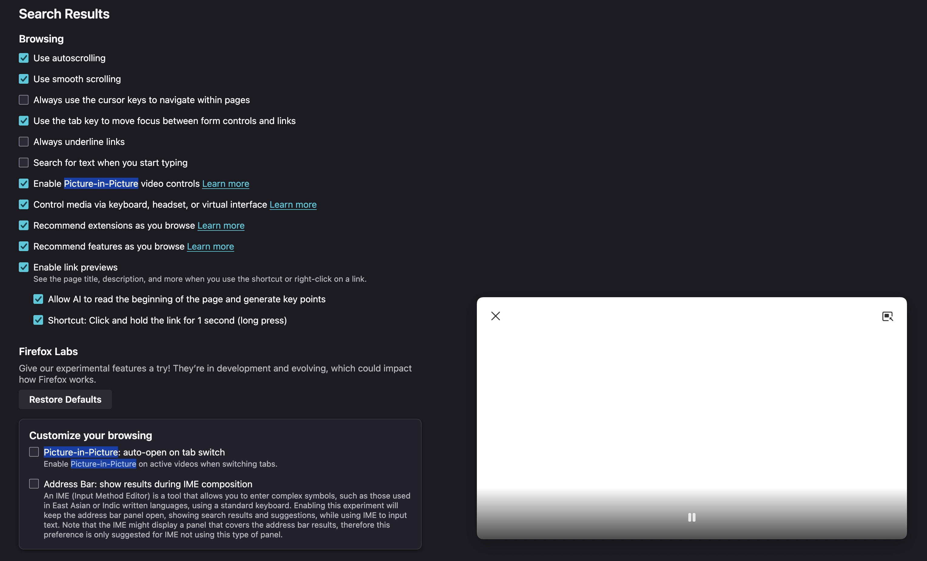 When I close a tab that had a video playing, the picture-in-picture box will stay there after I close the tab. The picture is just a white box. The controls are there, but when I click on any button, nothing happens. I can only move the box around and resize it. It usually happens when I close the tab while the video is playing, but sometimes it happens when I close the tab and the video is paused. It happens on videos that were in a picture-in-picture box and videos that weren't. I go into setting and disable picture-in-picture which will stop new picture-in-picture boxes, but won't get rid of the white box. The only way to get rid of the white box is to close FireFox completely and then reopen it.