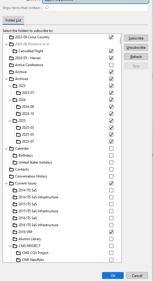 I use a work email server outsourced to office365.com and Thunderbird v115.18.0 (64-bit). I connect using Thunderbird with IMAP, and am subscribed to 100s of my folders there. I reorganized my folders there, moving them about using THUNDERBIRD (not, as I've learned now, using the Outlook Web interface that I "should" have used). Needless to say, I was only moving subscribed folders about. Now I find that the subscriptions to folders which have been moved or even deleted cannot be manipulated. Folders with the same name but now in different hierarchies can't be subscribed to. I have removed the account, recreated it and Unsubscribed from EVERY FOLDER. But the erroneous subscriptions do not go away.