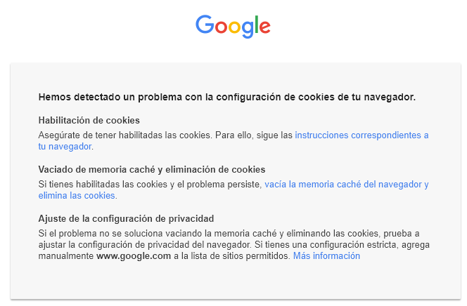 'Hemos detectado un problema con la configuración de cookies de tu navegador.'''