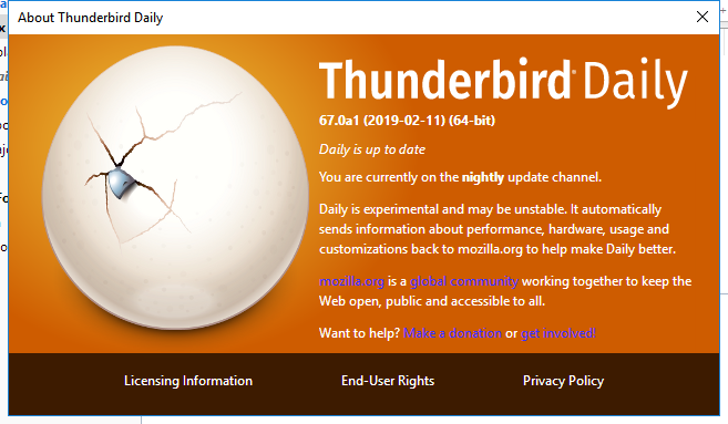 Agrego algo: La version Beta ya corre en 64bits La version Nightly es el nueva version del programa llamada "Thunderbird Daily" y corre también en 64bits Tengo ambas funcionando en Windows 10 64bits, Ver imágenes adjuntas.