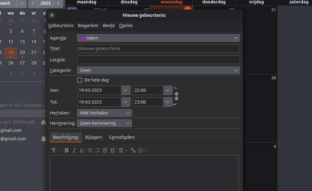 Op advies alle agenda's afgemeld (op één na, deze kan niet verwijderd worden) Opnieuw aanmaken via dialoogbox, er staat er nog één die niet te lezen is. Nieuwe agenda aangemaakt. Daarna geprobeerd een nieuwe gebeurtenis aan te maken in de agenda, nu is deze uitgegrijsd en inactief. Zie schermafbeelding in de bijlage.