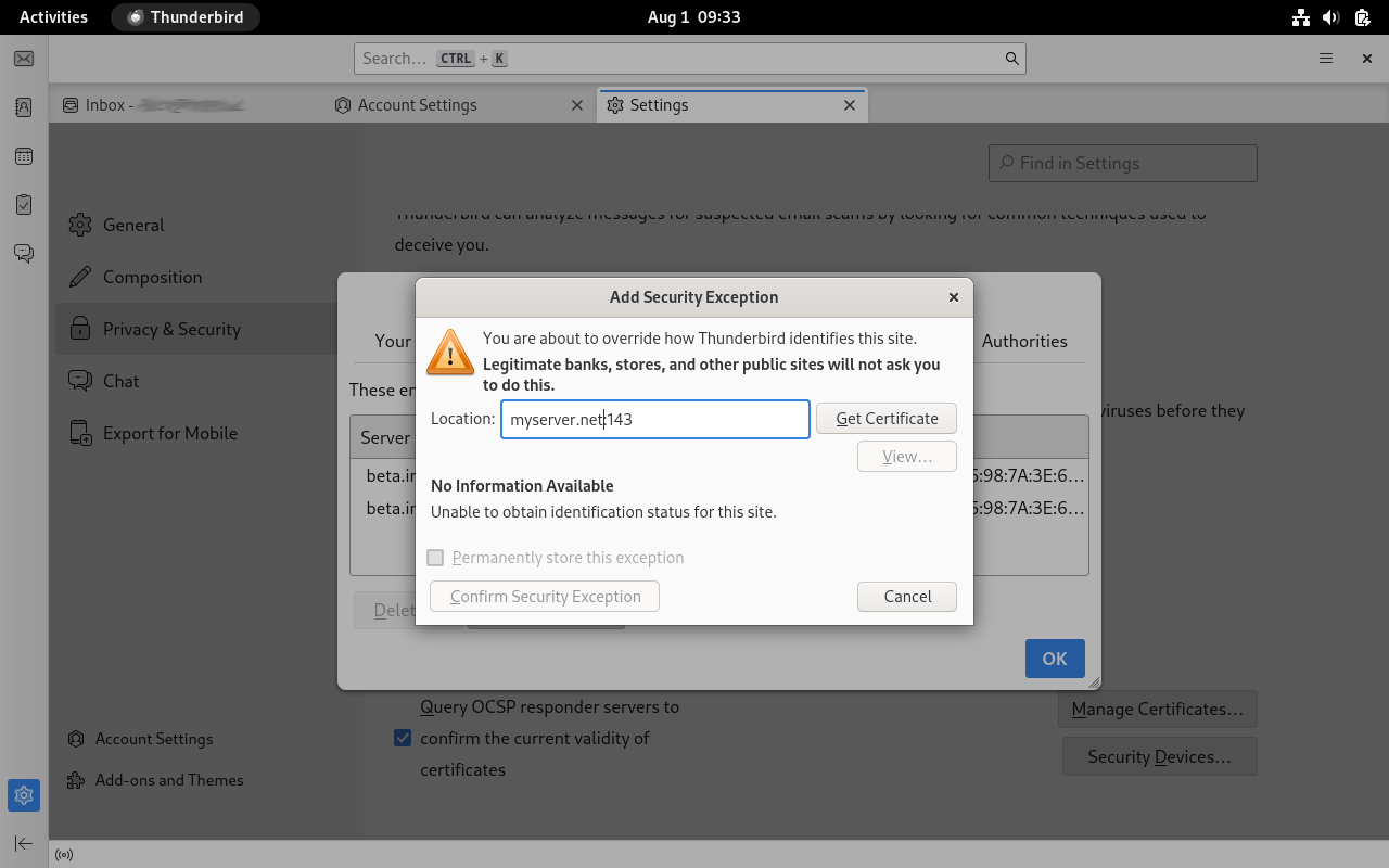 The Servers tab had a button for 'Add Exception'. I tried to add an exception, but it wasn't clear how this is supposed to work. I tried entering a location in form that is shown by existing exceptions and clicking on the Get Certificate button, but this resulted in a response of "No Information Available ... Unable to obtain identification status for this site." Is there any documentation or hints on how this is supposed to work?