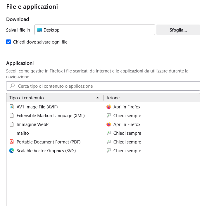 Vorrei poter aprire gli allegati su Firefox senza che siano scaricati su pc, nella cartella Download o altre cartelle scelte da me. Questo perché molti allegati, una volta aperti, mi sono del tutto inutili e possono essere cestinati. Altri vorrei salvarli nella cartella che decido io. Vedo però che comunque vengono sempre salvati di default nella cartella da me scelta (in questo caso il desktop, vedi immagine)