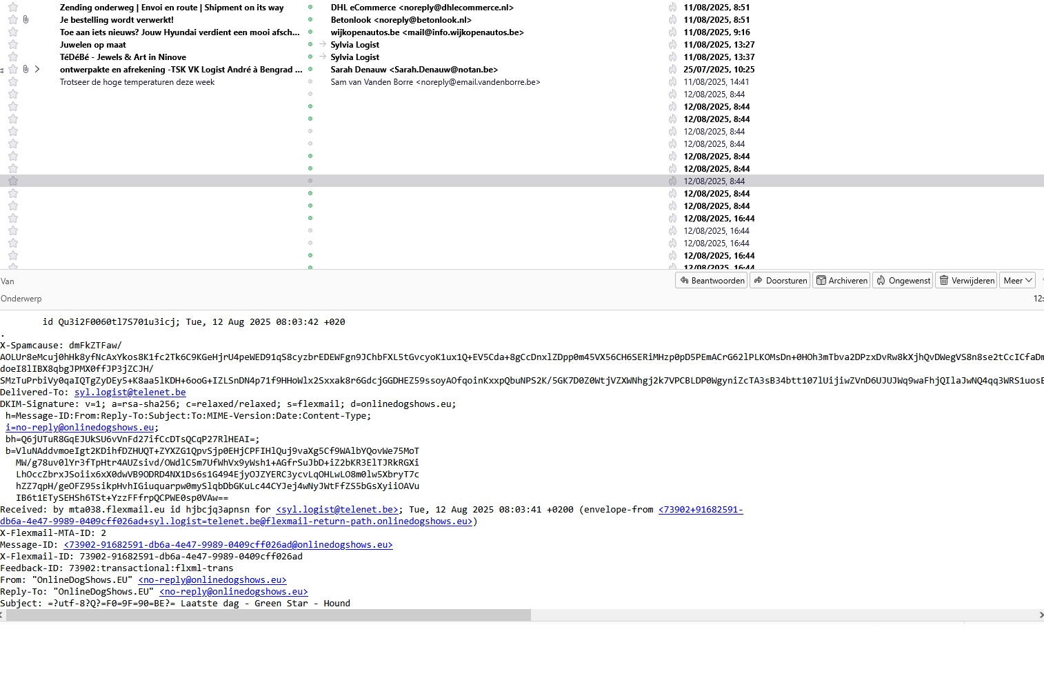 Dit wordt helaas veroorzaakt door Bitdefender en treft ook Outlook. Meer meldingen op https://www.reddit.com/r/Thunderbird/comments/1mo693n/comment/n8ammvq/ en https://support.mozilla.org/en-US/questions/1528715#answer-1755876. Workaround: In Bitdefender -> Protection -> Online Threat Prevention -> toggle off the setting Encrypted web scan. (Disabling Bitdefender Antispam does not help.) De workaround werkt niet voor iedereen en al ontvangen berichten blijven in het onleesbare formaat.