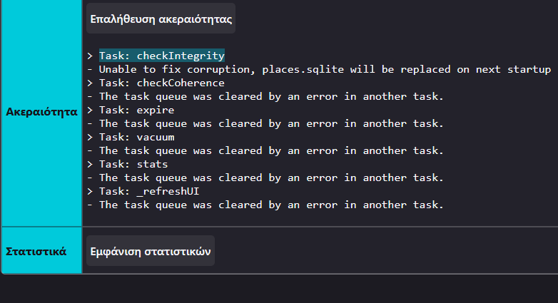 > Task: checkIntegrity + The places.sqlite database is sane + The favicons.sqlite database is sane > Task: invalidateCaches + The caches have been invalidated > Task: checkCoherence + The database is coherent