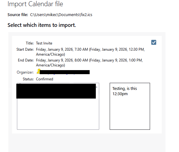 In the past week or so (since the holidays, perhaps), meeting invites I am getting are not converting the time correctly. I can make it work by manually editing the ics file and changing the first TZID from America/Chicago to US/Central I. The screen SHOWS the correct time (image atached) , but it imports as it the time was UTC