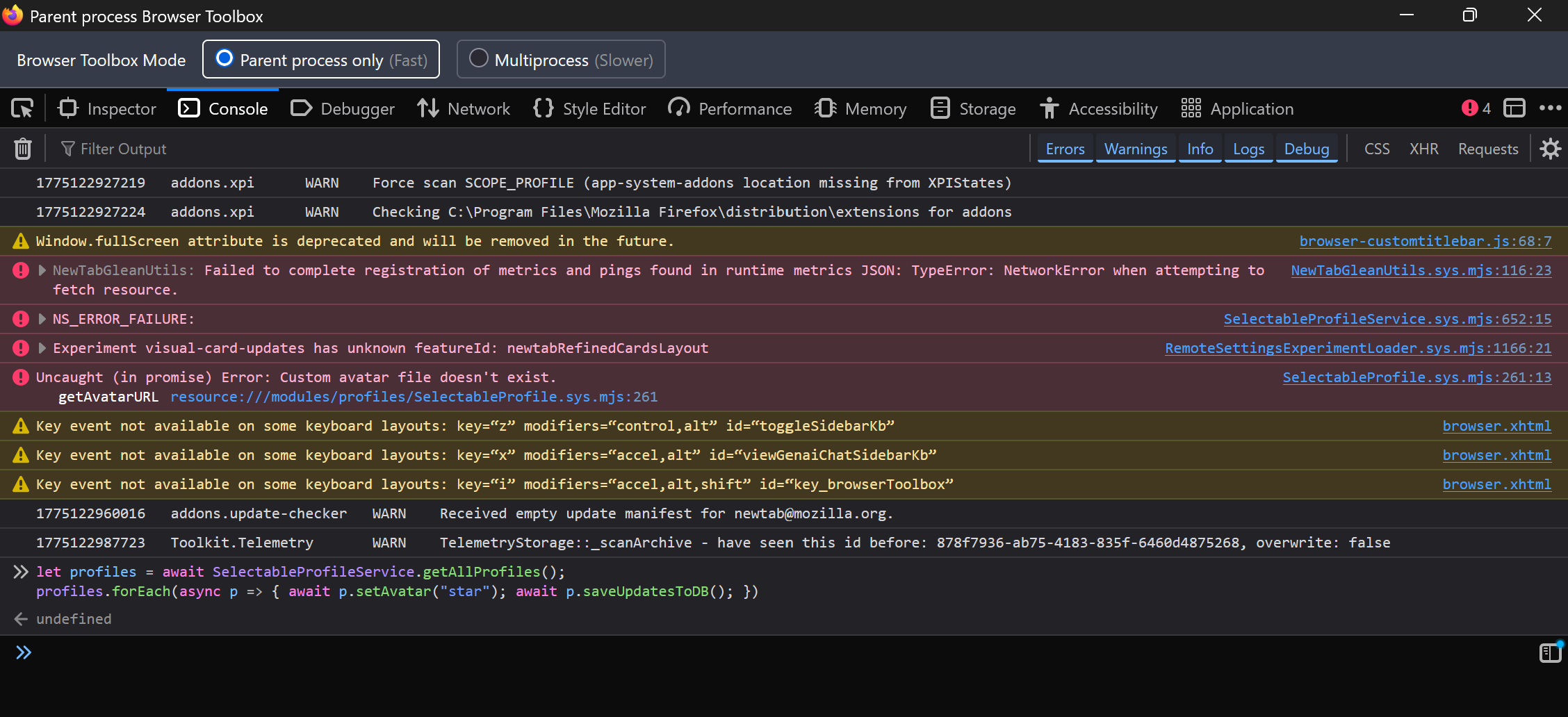 So, please launch one of the profiles in your profile group, open the Browser Toolbox to the Console tab, and run the following two-liner: