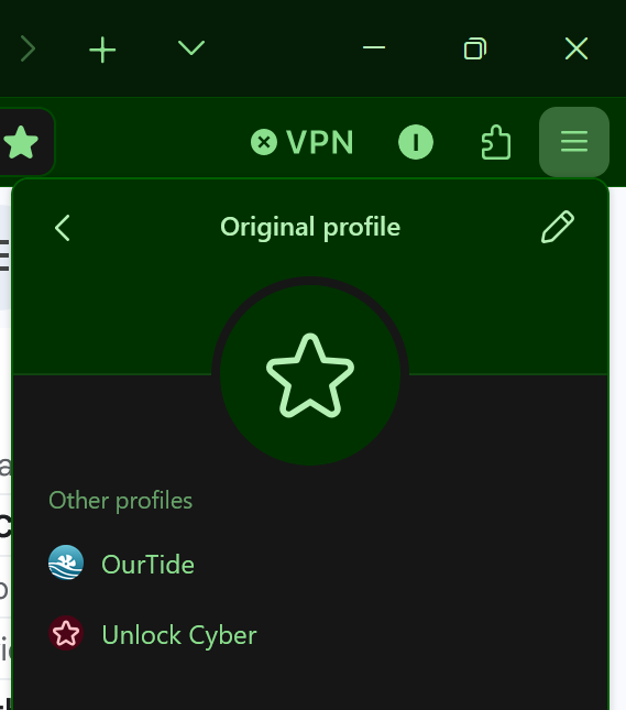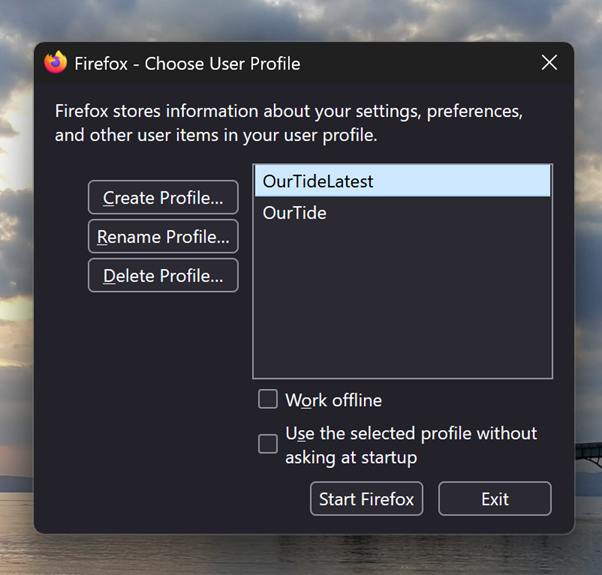 And I can also change profiles from the profile menu here. At first I thought this was a perfect fix (other than the toolbar shortcut to Firefox which doesn't allow me to lauch the original profile) but the profiles on the 'wrong' profile selector are misnamed as the 'OurTideLatest' listed actually points to the OurTide profile, and the 'OurTide' listed points to the Unlock Cyber profile, which is confusing!