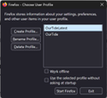 Adding a managed profile to a profile group For managed profiles, as a first step we need to remove the profile's entry from profiles.ini, and then we'll just go through the steps above for an unmanaged profile. The most reliable way to do this is to use the profile manager dialog shown when you run `firefox -P` at the command line. OK, I had to insert ‘start’ to give ‘start firefox -p’ (running cmd as admin again). This gave me this dialogue: https://assets-prod.sumo.prod.webservices.mozgcp.net/media/uploads/images/2026-04-01-06-43-08-5dd42f.png