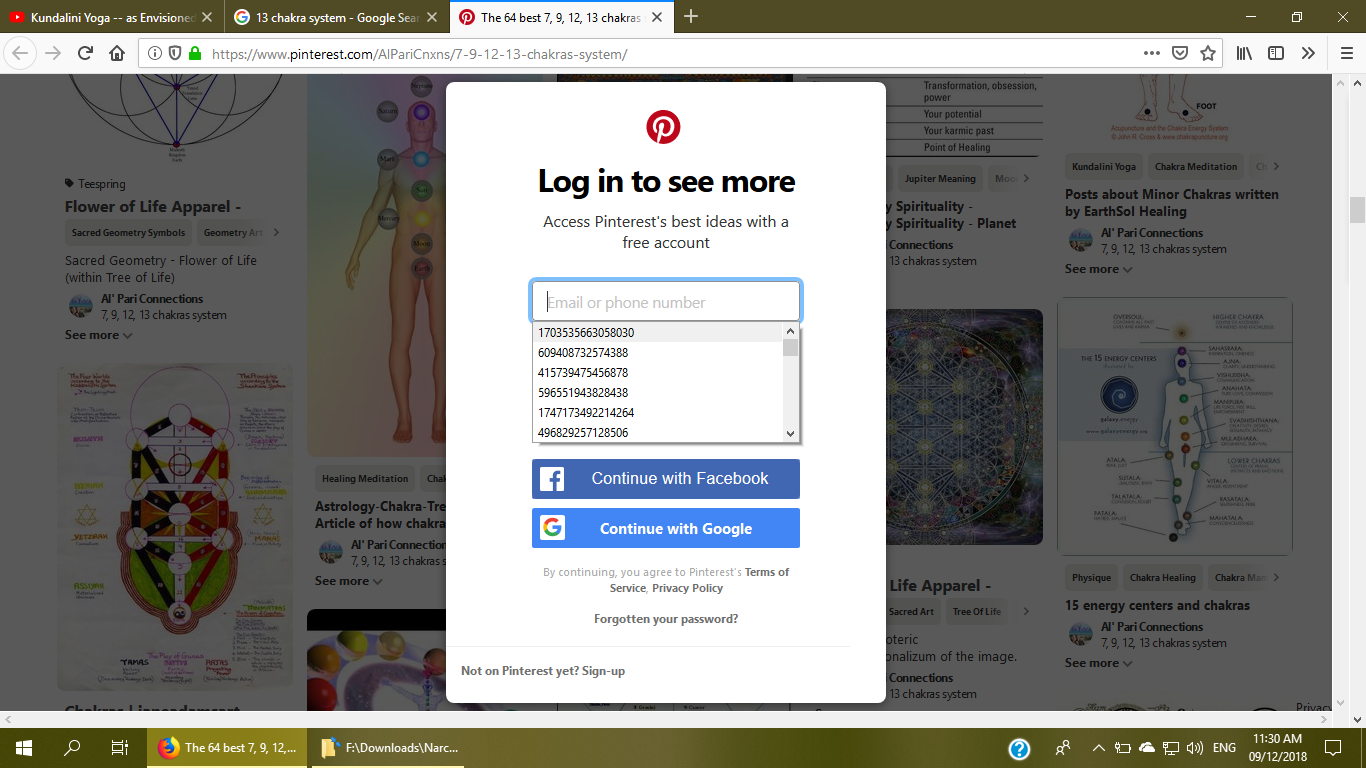 When I clicked on Pinterest user name field I god a large list of random 15 and 16 digit random numbers which I have never even entered in any other field in Firefox. The list is very long to scroll down.