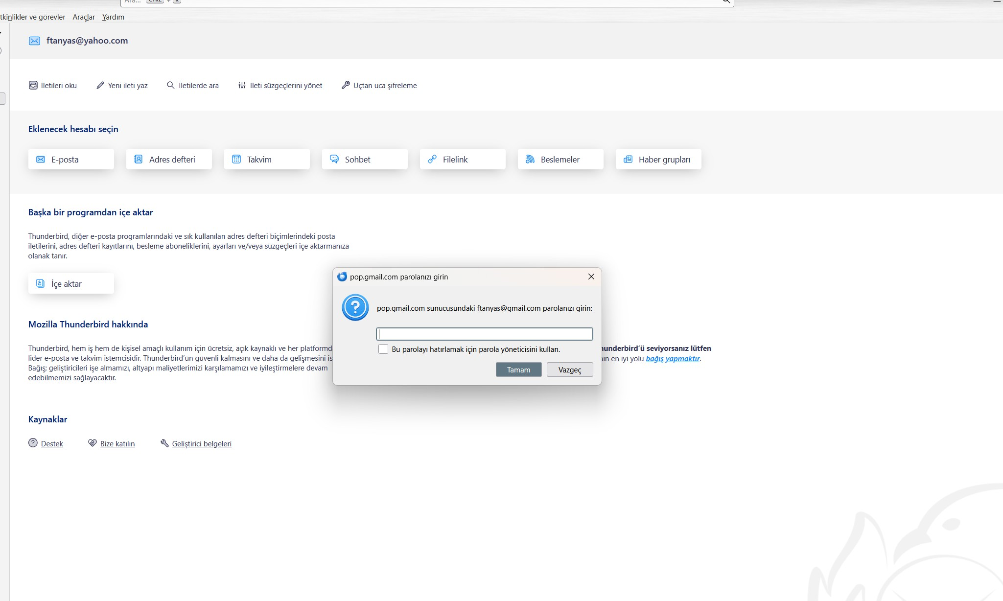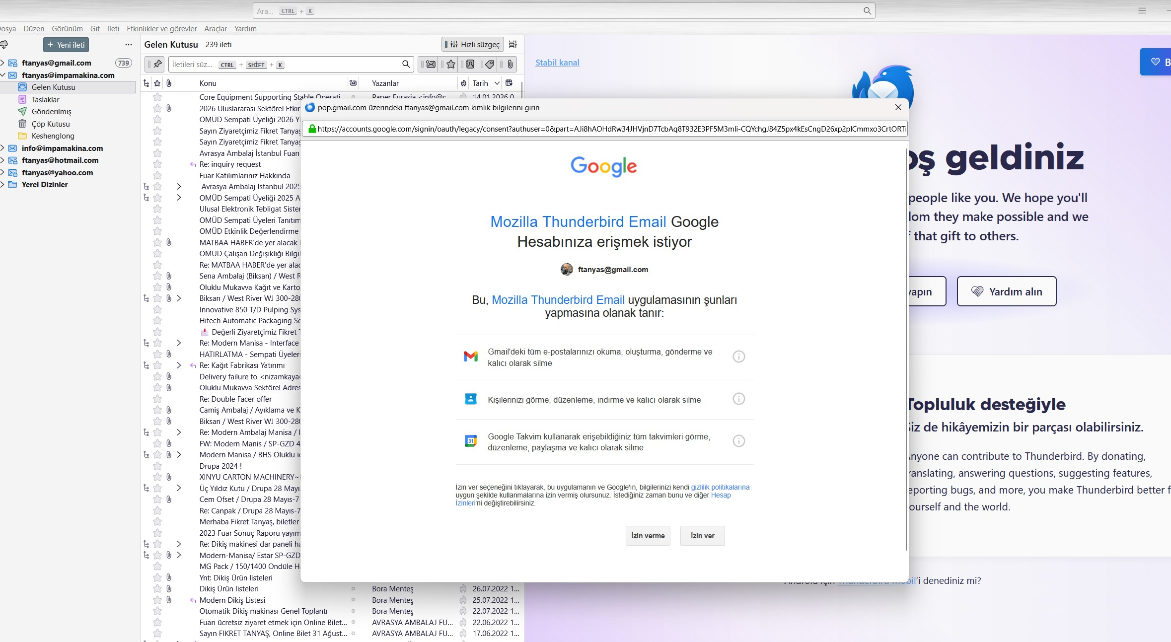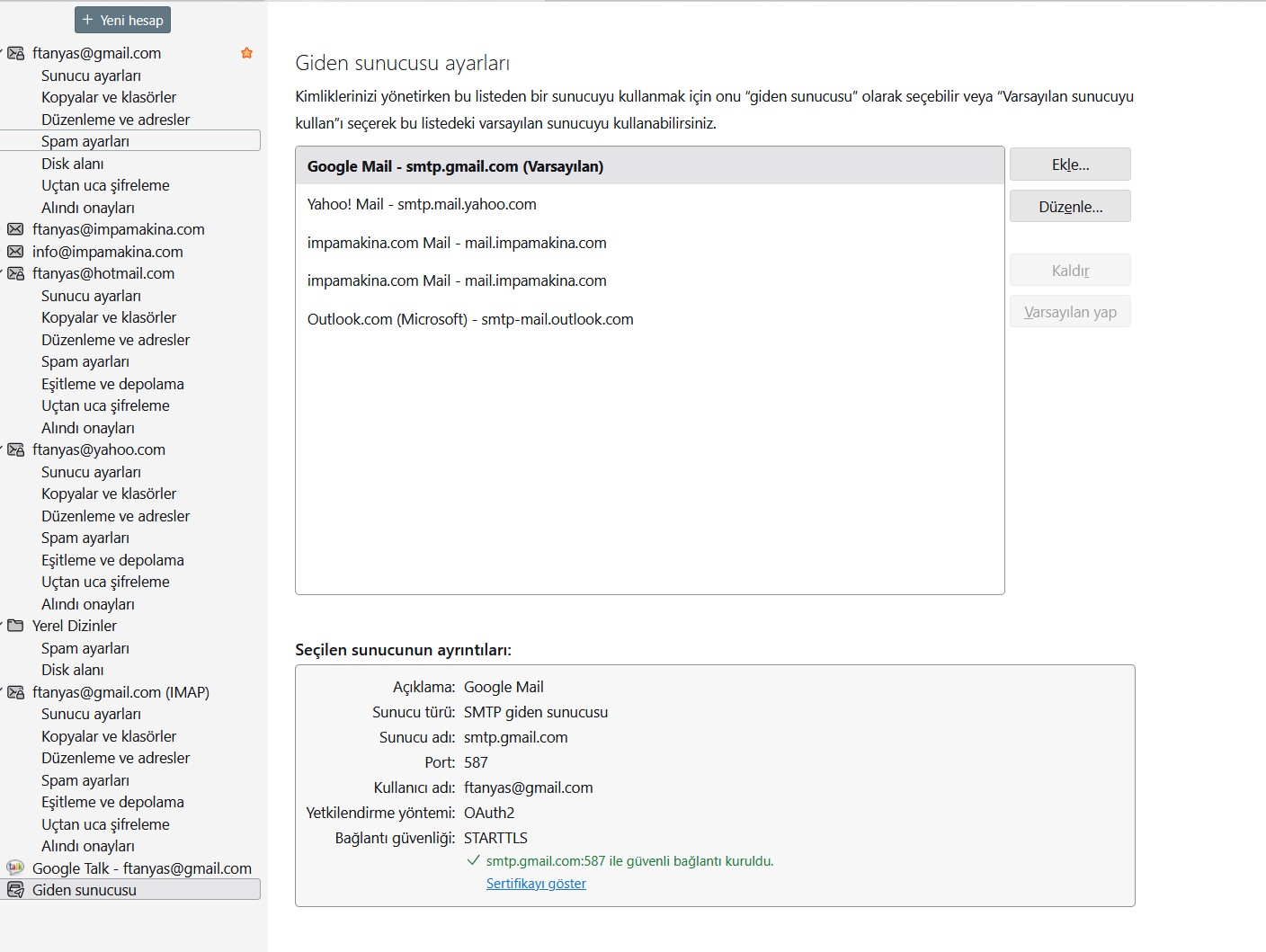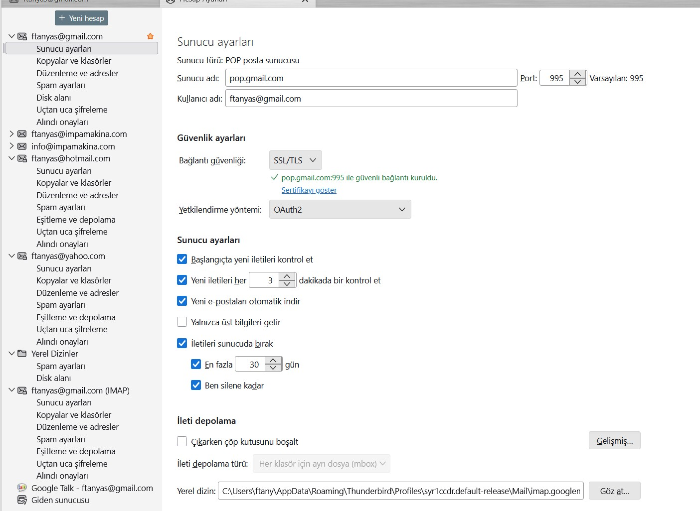 Bu ayarlarınız düzgün görünüyor. Bir de şunu deneyelim: Menü > Ayarlar > Gizlilik ve Güvenlik > Kayıtlı parolalar düğmesine tıklayın. "oauth://" ile başlayan satırı seçip Kaldır'a tıklayın. Ardından Thunderbird'ü kapatıp açın. Gmail hesabınıza yeniden giriş yapmanızı istemesi lazım.