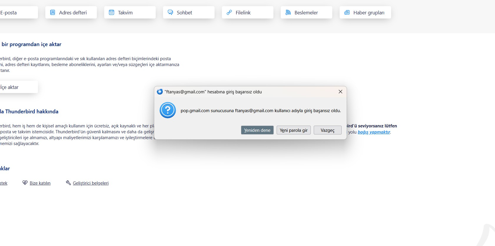Hello there.I hav been using Thunderbird client for long time.I always manage my emails over that program.Recently I have a problem for the access to my gmail account.I have been managing my gmail account over Thunderbird for long time.No any issue until now.Last week I was out of town and after I came back and download my emails from the server the program asked me to enter my new password.I had already changed it via my mobile.But unfortunately no matter what I did there is an access issue.My password did not accept it.I checked again but other platforms it is working.I have tried many many times to enter my password but it always failed.Unfortunately I could not download my emails since 14th Jan 2026 to my computer.I used special program code from google and only old emails downloaded again.I have checked the server settings and all of them is correct.I prefer to use pop protocol instead of imap.I have tried many things but nothing changed.I have contacted google but they advised me to contact to Thunderbird team.I have cheanged my google password over my phone because of some unauthorized action.I checked the other security details over my google account but all the same,not any changes.So I will kindly ask you to help for my issue and show me how to fix it.This is important because I am using that gmail account for my job.Best regards.