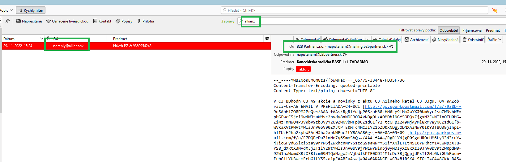 Good morning, I would like to ask you advice with view of original message. I obtained message from sender Allianz company and when I click on this message display me message from other sender <napistenam@mailing.b2bpartner.sk> and Im not able display original message from Allianz with attchment. Can I fix it? Please see picture in attachment. BR, Tibor