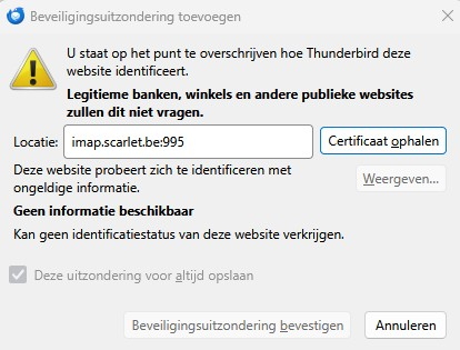 Beste, Met Thunderbird mail krijg ik recent telkens volgende melding: "Het certificaat voor imap.scarlet.be komt niet van een vertrouwde bron."