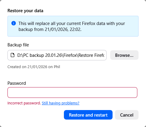 I have just replaced my PC after the old one decided not to connect to the net & performed a backup of just about everything. Tried to restore Firefox backup & it's asking for a password when I didn't create one! I've tried the Firefox sign in password but that was rejected - any ideas anyone? Thanks