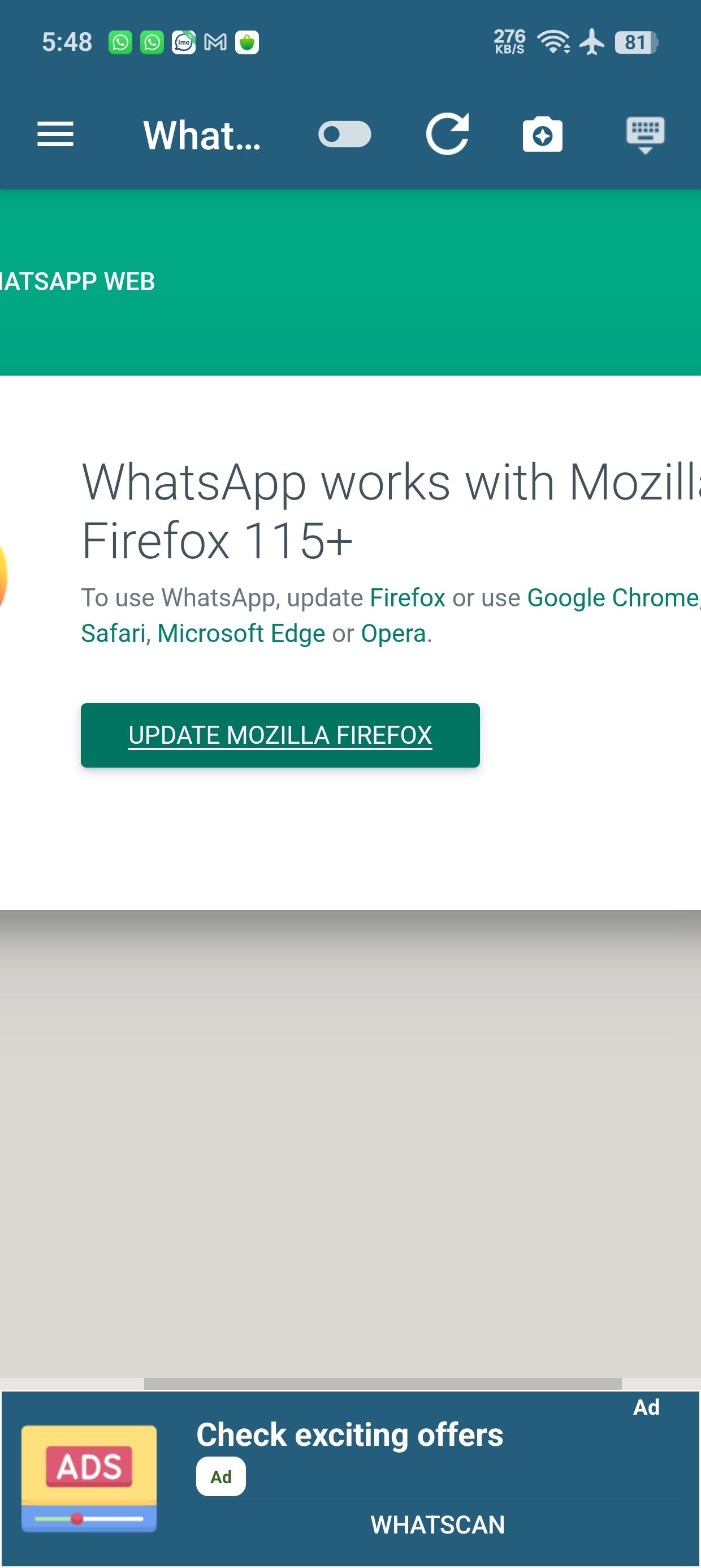 To use WhatsApp, update Firefox or use Google Chrome, Safari, Microsoft Edge or Opera.