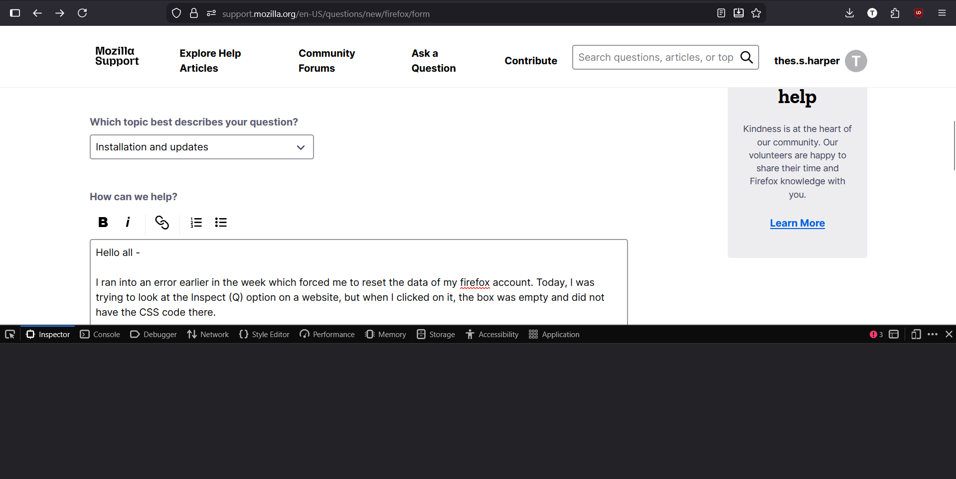 I ran into an error earlier in the week which forced me to reset the data of my firefox account. Today, I was trying to look at the Inspect (Q) option on a website, but when I clicked on it, the box was empty and did not have the CSS code there.