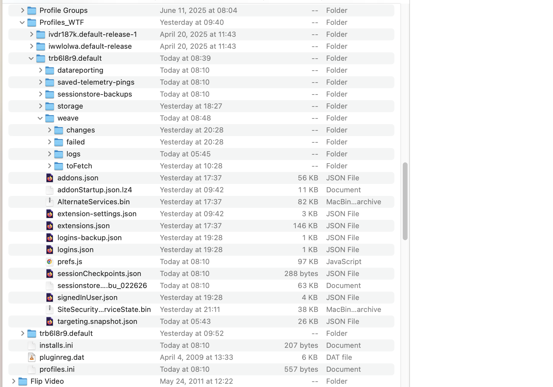 FF 148.0 was running on MacOS with my profile as a folder (e.g, trb618r9.default) under Firefox. When I looked in history it was empty so I restarted FF, none of my tabs were there, and TreeStyleTabs didn't display. Investigating I see a new folder named Profiles that has a profile in it with the trb618r9.default name but not all the data in the original trb618r9.default. I renamed the "new trb618r9.default" and moved the original trb618r9.default to Profiles and restarted FF but still am not seeing the original fxxx data which still exists. Screenshot of finder before I renamed etc. as described above shows the two same named profiles. How can I recover?