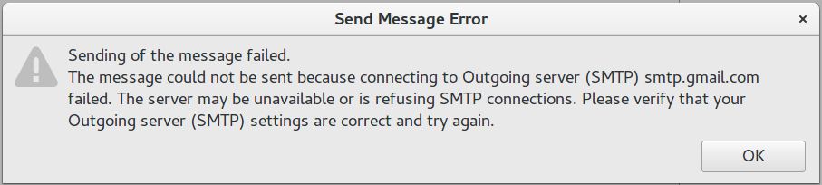 Sometimes TB cannot send the emails but sometimes it indeed can (receiving emails always works fine). I am mainly using Gmail and the email provided by my university and usually either both of them work or both don't. Attached is the error that I am getting. I don't have any antivirus software and my operating system is Gnome Ubuntu 16.04 and TB version is 52.7.0. I am usually connected to internet provided by my university, which uses WPA2&Enterprise encryption and PEAP Authentication if it matters. The problem is very annoying as I cannot even reproduce the error consistently, let alone finding a solution.