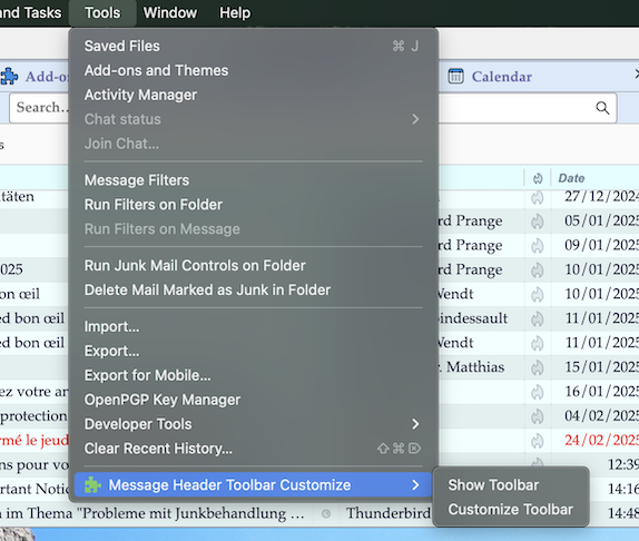 I did ask for images so we could check that A) the addon extension ' Message Header Toolbar Customize' was installed AND enabled B) we could see what was displaying in the 'Tools' drop down menu